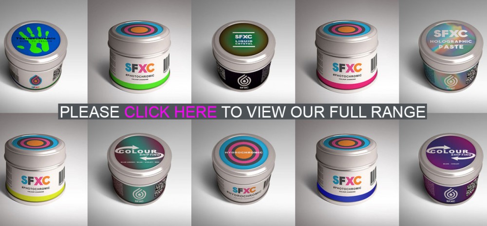Manufacturers and suppliers of best price colour changing paint and colour changing ink currently for sale. These color changing hydrochromic and photochromic coatings include hydrochromic inks and colour changing pigments, that include photochromic ink, thermochromic ink or photochromic coatings. These colour changing pigments are used in colour changing car paint using thermographic paint or sometimes hydrochromic paint to create a colour shifting effect that changes visually depending on the angle viewed. Liquid crystal ink, thermochromatic and new holographic ink is now being used as a special effect and coating to get a really fascinating and exciting special effect.
